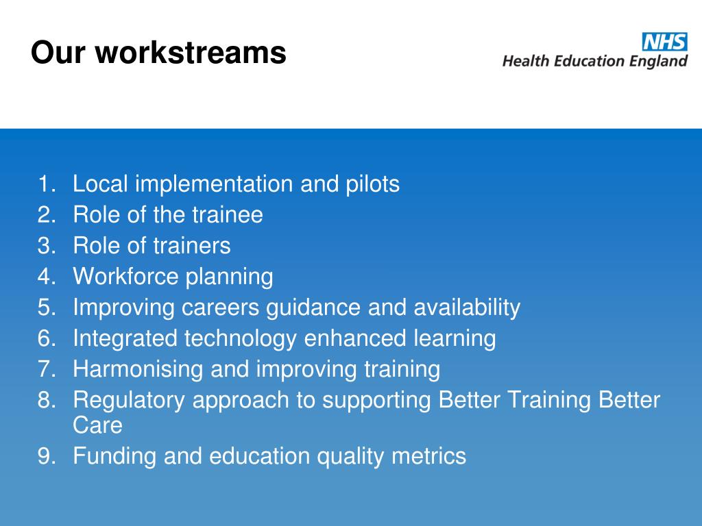 Our workstreams • Local implementation and pilots • Role of the trainee • Role of trainers • Workforce planning • Improving careers guidance and availability • Integrated technology enhanced learning • Harmonising and improving training • Regulatory approach to supporting Better Training Better Care • Funding and education quality metrics