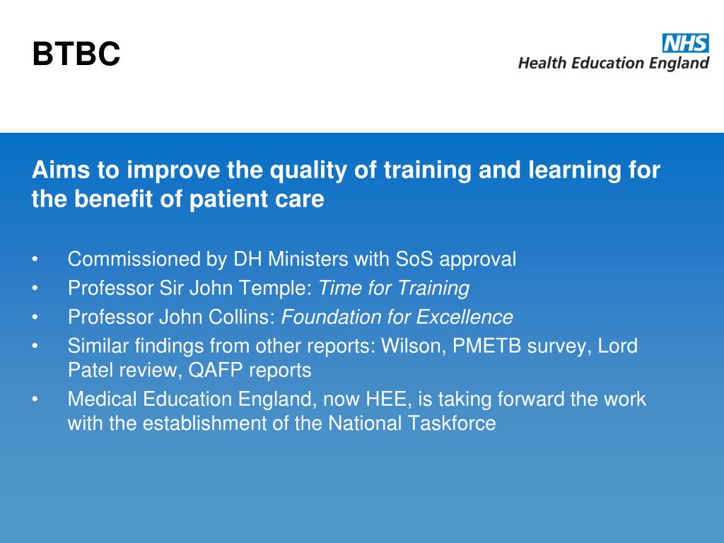BTBC • Aims to improve the quality of training and learning for • the benefit of patient care • Commissioned by DH Ministers with SoS approval • Professor Sir John Temple: Time for Training • Professor John Collins: Foundation for Excellence • Similar findings from other reports: Wilson, PMETB survey, Lord Patel review, QAFP reports • Medical Education England, now HEE, is taking forward the work with the establishment of the National Taskforce