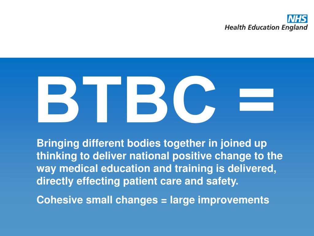 BTBC = Bringing different bodies together in joined up thinking to deliver national positive change to the way medical education and training is delivered, directly effecting patient care and safety. Cohesive small changes = large improvements