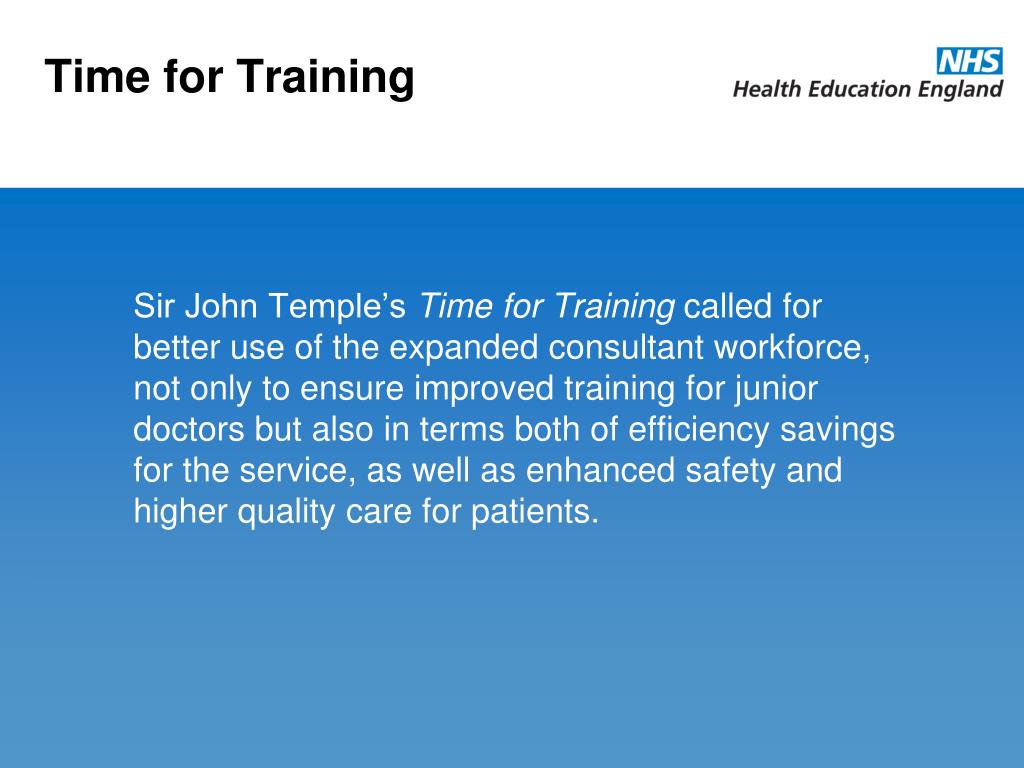 Time for Training • Sir John Temple’s Time for Training called for better use of the expanded consultant workforce, not only to ensure improved training for junior doctors but also in terms both of efficiency savings for the service, as well as enhanced safety and higher quality care for patients.