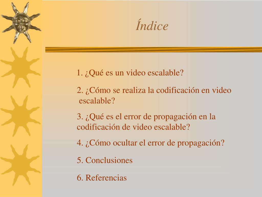 Índice 1. ¿Qué es un video escalable? 2. ¿Cómo se realiza la codificación en video escalable? 3. ¿Qué es el error de propagación en la codificación de video escalable? 4. ¿Cómo ocultar el error de propagación? 5. Conclusiones 6. Referencias