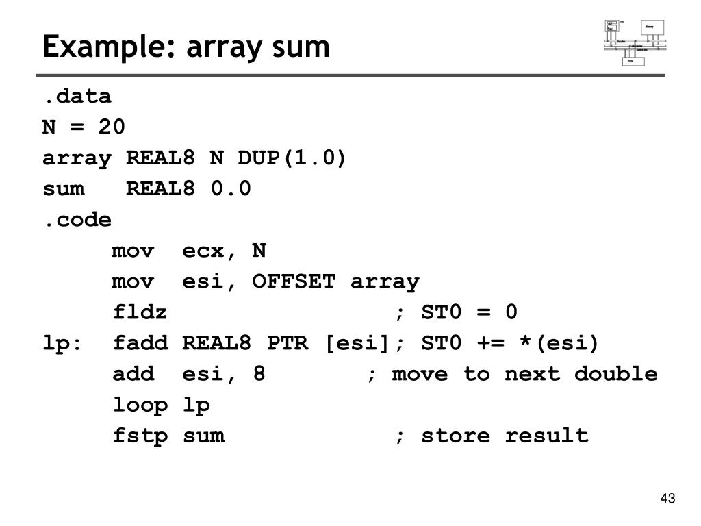 Example: array sum .data N = 20 array REAL8 N DUP(1.0) sum REAL8 0.0 .code mov ecx, N mov esi, OFFSET array fldz ; ST0 = 0 lp: fadd REAL8 PTR [esi] ; ST0 += *(esi) add esi, 8 ; move to next double loop lp fstp sum ; store result