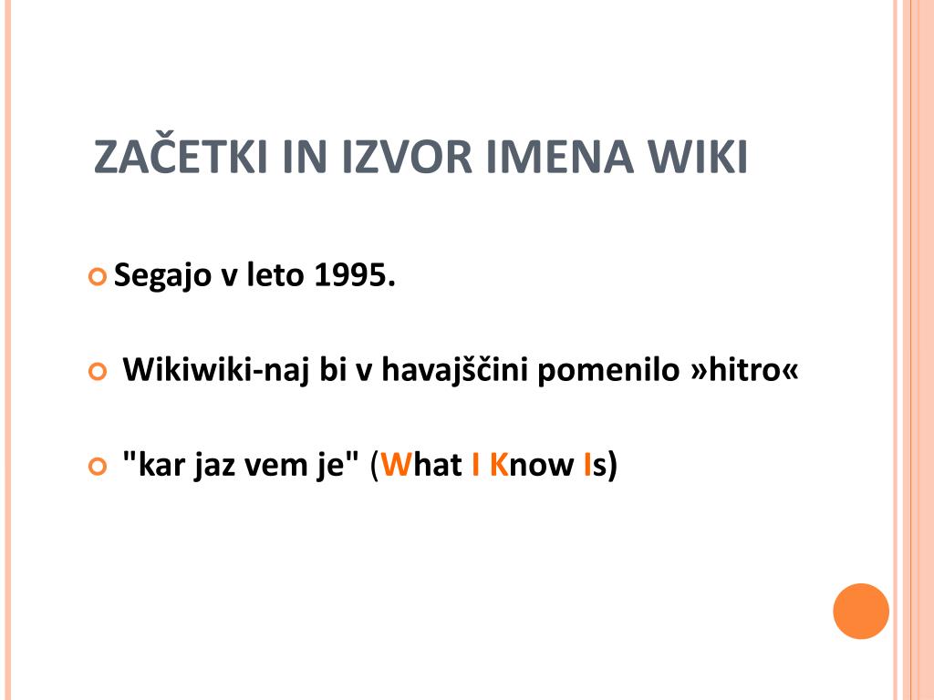 ZAČETKI IN IZVOR IMENA WIKI • Segajo v leto 1995. • Wikiwiki-naj bi v havajščini pomenilo »hitro« • "kar jaz vem je" (What I Know Is)