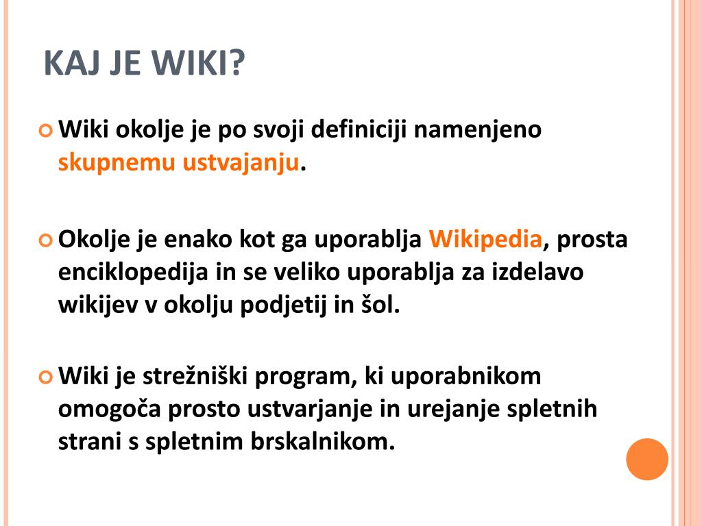 KAJ JE WIKI? • Wiki okolje je po svoji definiciji namenjeno skupnemu ustvajanju. • Okolje je enako kot ga uporabljaWikipedia, prosta enciklopedijain se veliko uporablja za izdelavo wikijevv okolju podjetij in šol. • Wiki je strežniški program, ki uporabnikom omogoča prosto ustvarjanje in urejanje spletnih strani s spletnim brskalnikom.