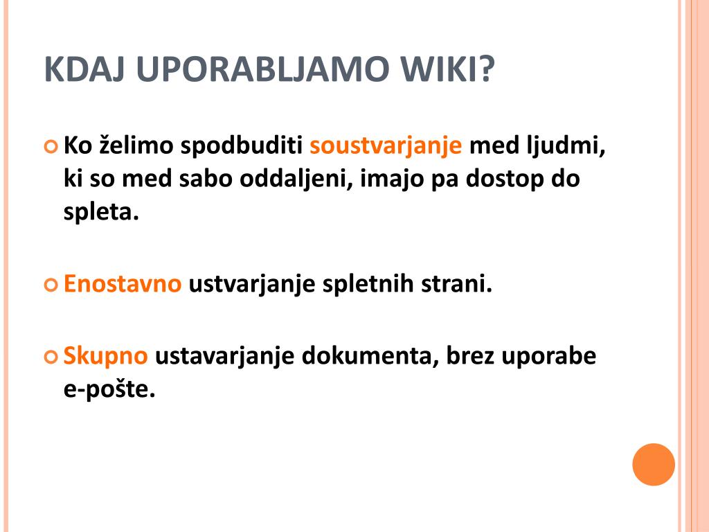KDAJ UPORABLJAMO WIKI? • Ko želimo spodbuditi soustvarjanje med ljudmi, ki so med sabo oddaljeni, imajo pa dostop do spleta. • Enostavno ustvarjanje spletnih strani. • Skupno ustavarjanje dokumenta, brez uporabe e-pošte.