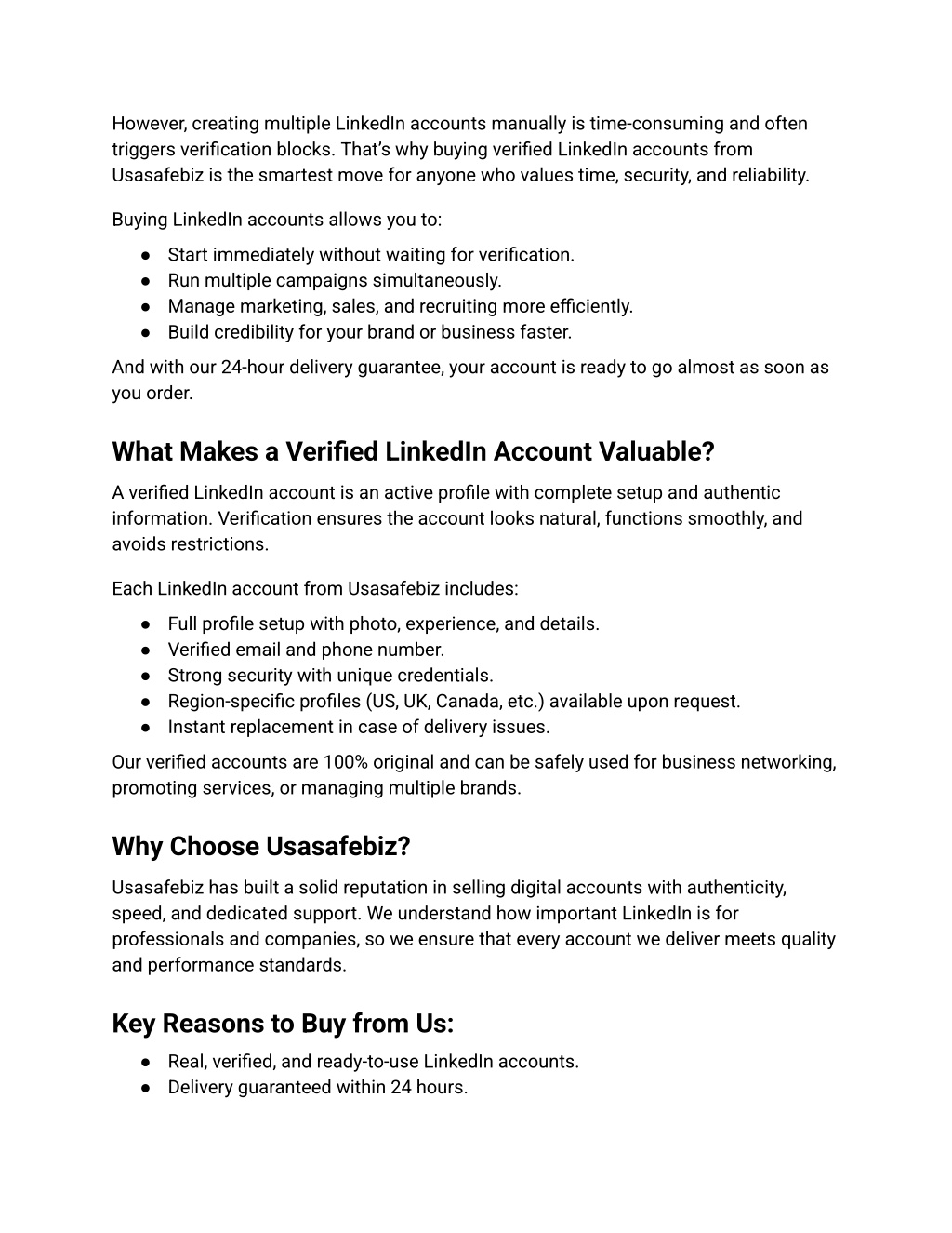 3. However, creating multiple LinkedIn accounts manually is time-consuming and often triggers verification blocks. That’s why buying verified LinkedIn accounts from Usasafebiz is the smartest move for anyone who values time, security, and reliability. Buying LinkedIn accounts allows you to: ● Start immediately without waiting for verification. ● Run multiple campaigns simultaneously. ● Manage marketing, sales, and recruiting more efficiently. ● Build credibility for your brand or business faster. And with our 24-hour delivery guarantee, your account is ready to go almost as soon as you order. What Makes a Verified LinkedIn Account Valuable? A verified LinkedIn account is an active profile with complete setup and authentic information. Verification ensures the account looks natural, functions smoothly, and avoids restrictions. Each LinkedIn account from Usasafebiz includes: ● Full profile setup with photo, experience, and details. ● Verified email and phone number. ● Strong security with unique credentials. ● Region-specific profiles (US, UK, Canada, etc.) available upon request. ● Instant replacement in case of delivery issues. Our verified accounts are 100% original and can be safely used for business networking, promoting services, or managing multiple brands. Why Choose Usasafebiz? Usasafebiz has built a solid reputation in selling digital accounts with authenticity, speed, and dedicated support. We understand how important LinkedIn is for professionals and companies, so we ensure that every account we deliver meets quality and performance standards. Key Reasons to Buy from Us: ● Real, verified, and ready-to-use LinkedIn accounts. ● Delivery guaranteed within 24 hours.
