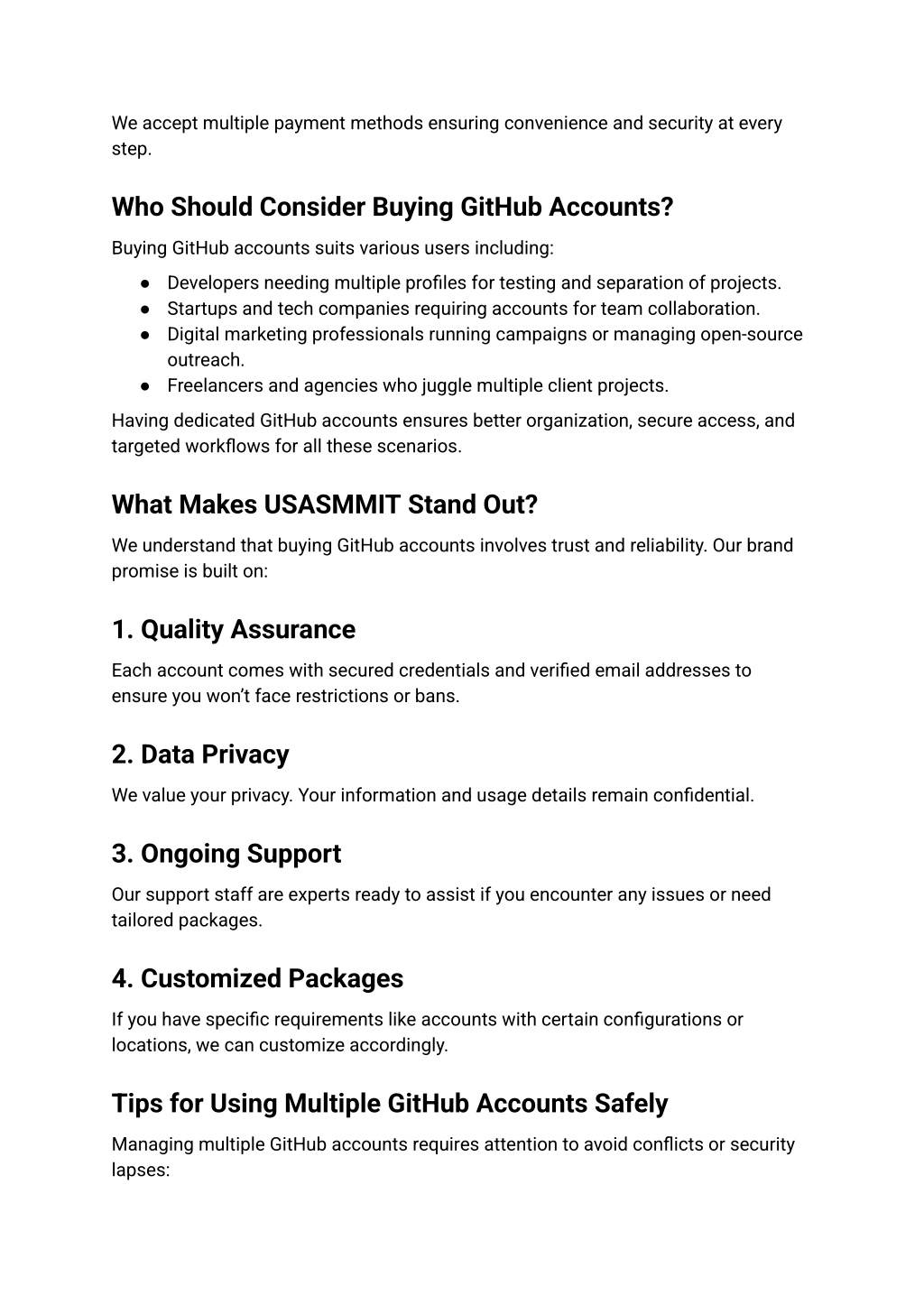 We accept multiple payment methods ensuring convenience and security at every step. Who Should Consider Buying GitHub Accounts? Buying GitHub accounts suits various users including: ● Developers needing multiple profiles for testing and separation of projects. ● Startups and tech companies requiring accounts for team collaboration. ● Digital marketing professionals running campaigns or managing open-source outreach. ● Freelancers and agencies who juggle multiple client projects. Having dedicated GitHub accounts ensures better organization, secure access, and targeted workflows for all these scenarios. What Makes USASMMIT Stand Out? We understand that buying GitHub accounts involves trust and reliability. Our brand promise is built on: 1. Quality Assurance Each account comes with secured credentials and verified email addresses to ensure you won’t face restrictions or bans. 2. Data Privacy We value your privacy. Your information and usage details remain confidential. 3. Ongoing Support Our support staff are experts ready to assist if you encounter any issues or need tailored packages. 4. Customized Packages If you have specific requirements like accounts with certain configurations or locations, we can customize accordingly. Tips for Using Multiple GitHub Accounts Safely Managing multiple GitHub accounts requires attention to avoid conflicts or security lapses: