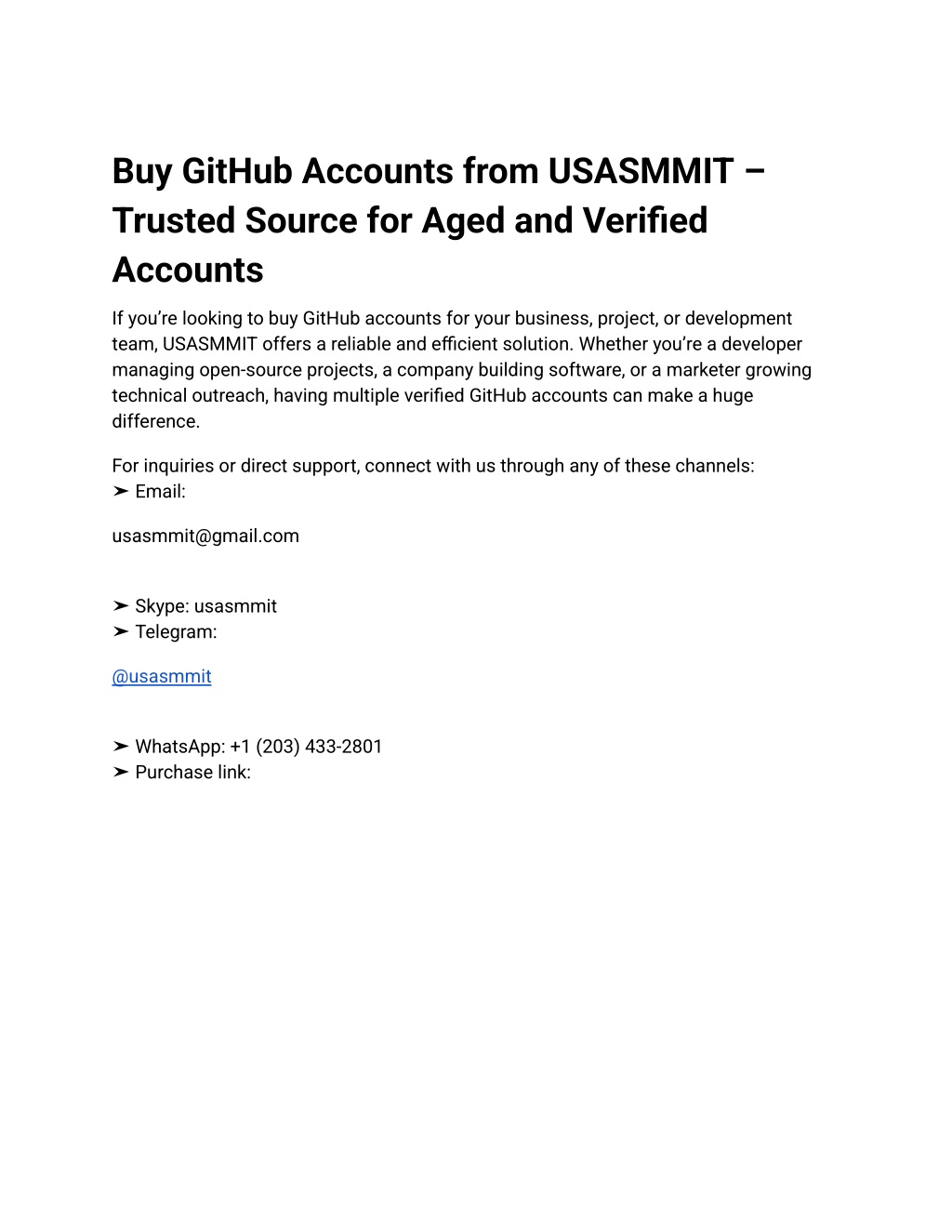 6. Following these steps helps you make the most of your investment while safeguarding your GitHub reputation. Why GitHub Matters for Your Business Growth GitHub is not just for coders—it’s a powerful ecosystem that supports team collaboration, version control, documentation, and open innovation. Companies use it to manage remote teams, track changes, and showcase professional portfolios. Buying verified GitHub accounts can accelerate your presence and productivity on this platform by enabling: ● Parallel development projects. ● Multiple contributor accounts for large teams. ● Enhanced visibility across repositories. ● Simplified testing and integration workflow. Get Started Today Ready to supercharge your development workflow? With USASMMIT, buying GitHub accounts is fast, secure, and affordable. Whether you’re managing client codebases or expanding your technical brand, our verified account services give you a head start. Visit our secure purchase page to get your order started: https://usasmmit.com/service/buy-github-accounts/ For direct assistance: ● Email: ● usasmmit@gmail.com ● Skype: usasmmit ● Telegram: @usasmmit ● WhatsApp: +1 (203) 433-2801 Take the next step in your digital growth—make your GitHub presence stronger and more reliable with USASMMIT.