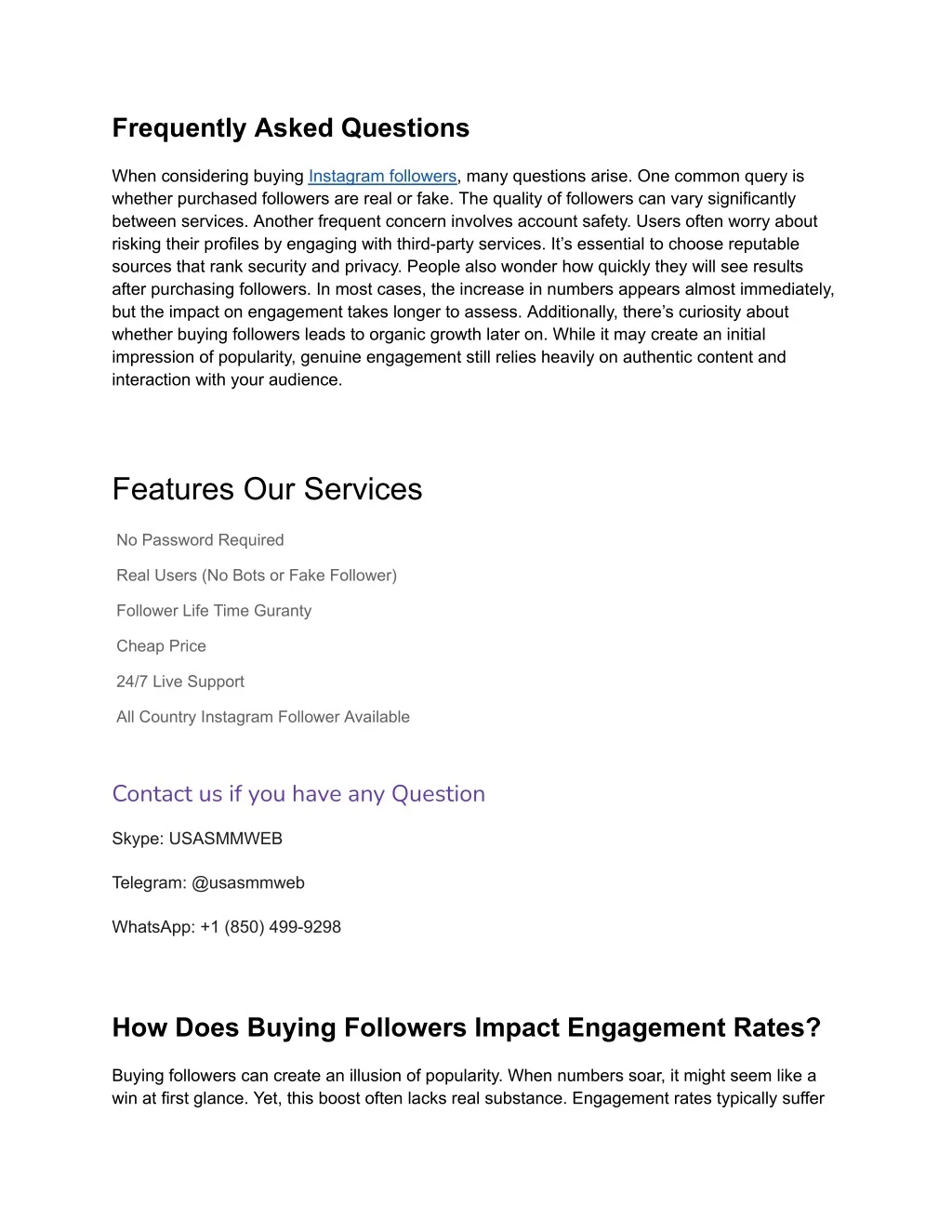 Frequently Asked Questions When considering buying Instagram followers, many questions arise. One common query is whether purchased followers are real or fake. The quality of followers can vary significantly between services. Another frequent concern involves account safety. Users often worry about risking their profiles by engaging with third-party services. It’s essential to choose reputable sources that rank security and privacy. People also wonder how quickly they will see results after purchasing followers. In most cases, the increase in numbers appears almost immediately, but the impact on engagement takes longer to assess. Additionally, there’s curiosity about whether buying followers leads to organic growth later on. While it may create an initial impression of popularity, genuine engagement still relies heavily on authentic content and interaction with your audience. Features Our Services No Password Required Real Users (No Bots or Fake Follower) Follower Life Time Guranty Cheap Price 24/7 Live Support All Country Instagram Follower Available Contact us if you have any Question Skype: USASMMWEB Telegram: @usasmmweb WhatsApp: +1 (850) 499-9298 How Does Buying Followers Impact Engagement Rates? Buying followers can create an illusion of popularity. When numbers soar, it might seem like a win at first glance. Yet, this boost often lacks real substance. Engagement rates typically suffer