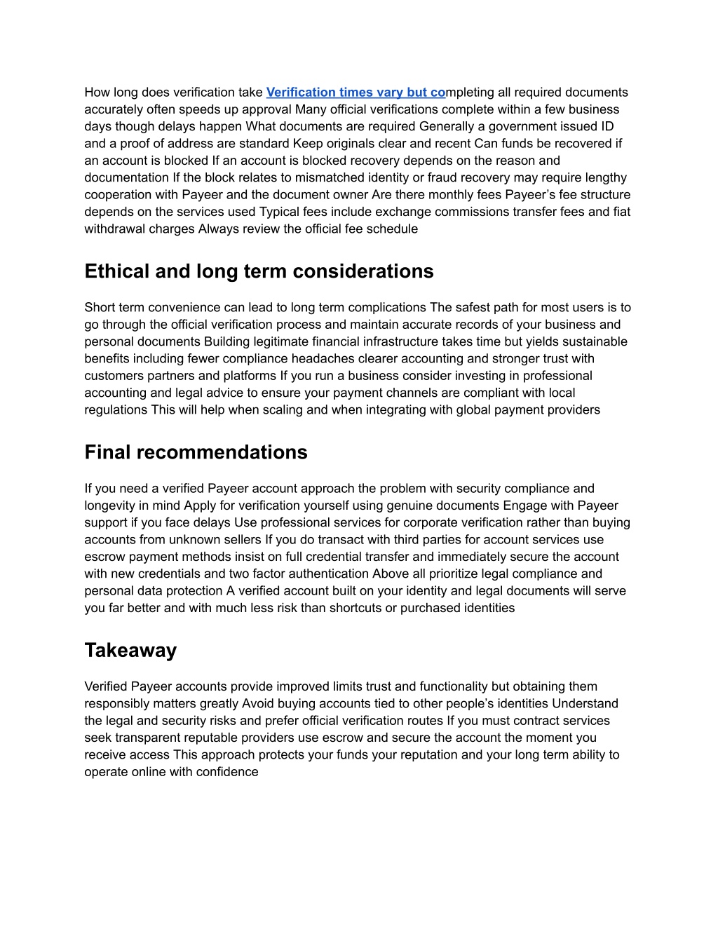 How long does verification take Verification times vary but completing all required documents accurately often speeds up approval Many official verifications complete within a few business days though delays happen What documents are required Generally a government issued ID and a proof of address are standard Keep originals clear and recent Can funds be recovered if an account is blocked If an account is blocked recovery depends on the reason and documentation If the block relates to mismatched identity or fraud recovery may require lengthy cooperation with Payeer and the document owner Are there monthly fees Payeer’s fee structure depends on the services used Typical fees include exchange commissions transfer fees and fiat withdrawal charges Always review the official fee schedule Ethical and long term considerations Short term convenience can lead to long term complications The safest path for most users is to go through the official verification process and maintain accurate records of your business and personal documents Building legitimate financial infrastructure takes time but yields sustainable benefits including fewer compliance headaches clearer accounting and stronger trust with customers partners and platforms If you run a business consider investing in professional accounting and legal advice to ensure your payment channels are compliant with local regulations This will help when scaling and when integrating with global payment providers Final recommendations If you need a verified Payeer account approach the problem with security compliance and longevity in mind Apply for verification yourself using genuine documents Engage with Payeer support if you face delays Use professional services for corporate verification rather than buying accounts from unknown sellers If you do transact with third parties for account services use escrow payment methods insist on full credential transfer and immediately secure the account with new credentials and two factor authentication Above all prioritize legal compliance and personal data protection A verified account built on your identity and legal documents will serve you far better and with much less risk than shortcuts or purchased identities Takeaway Verified Payeer accounts provide improved limits trust and functionality but obtaining them responsibly matters greatly Avoid buying accounts tied to other people’s identities Understand the legal and security risks and prefer official verification routes If you must contract services seek transparent reputable providers use escrow and secure the account the moment you receive access This approach protects your funds your reputation and your long term ability to operate online with confidence