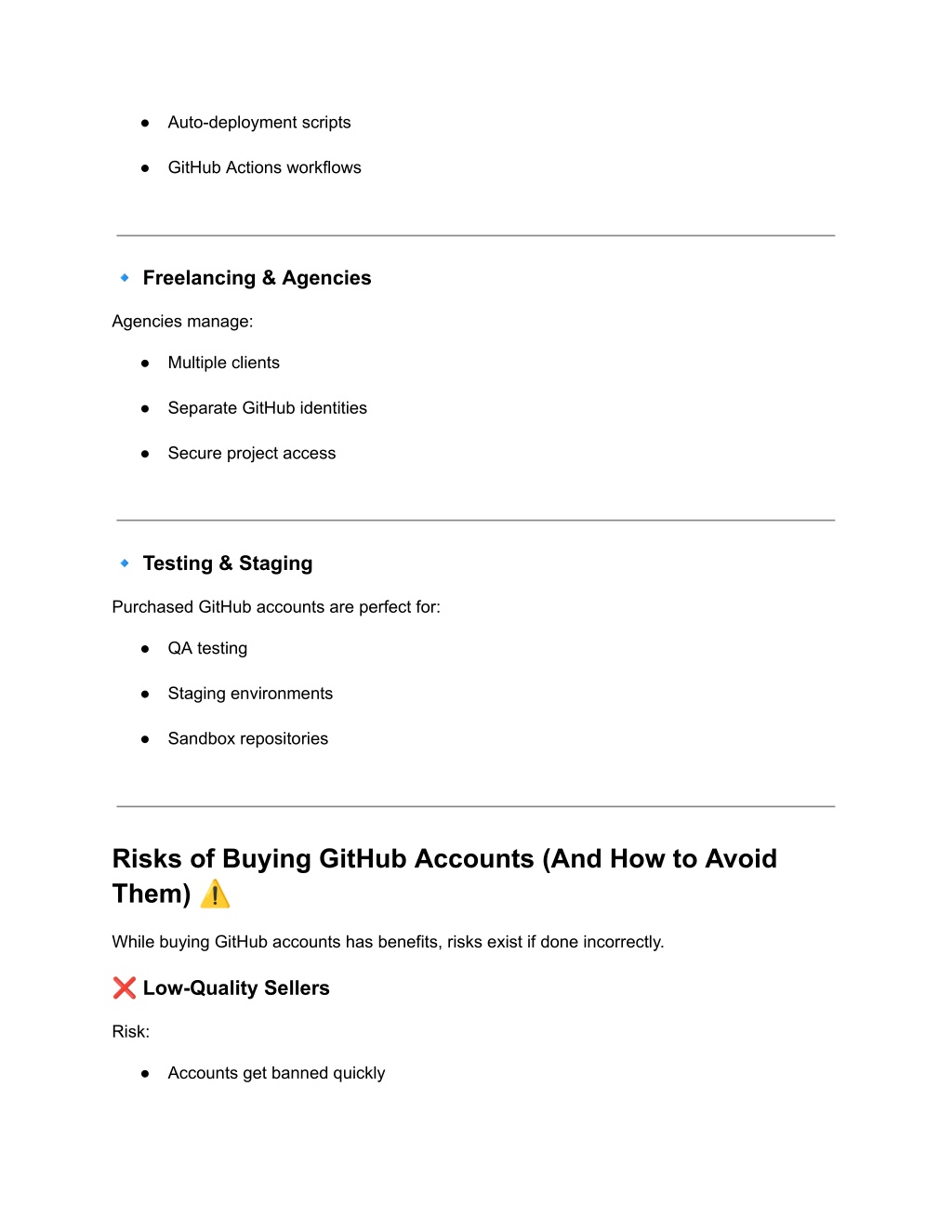 ● Auto-deployment scripts ● GitHub Actions workflows ? Freelancing & Agencies Agencies manage: ● Multiple clients ● Separate GitHub identities ● Secure project access ? Testing & Staging Purchased GitHub accounts are perfect for: ● QA testing ● Staging environments ● Sandbox repositories Risks of Buying GitHub Accounts (And How to Avoid Them) ⚠ While buying GitHub accounts has benefits, risks exist if done incorrectly. ❌ Low-Quality Sellers Risk: ● Accounts get banned quickly
