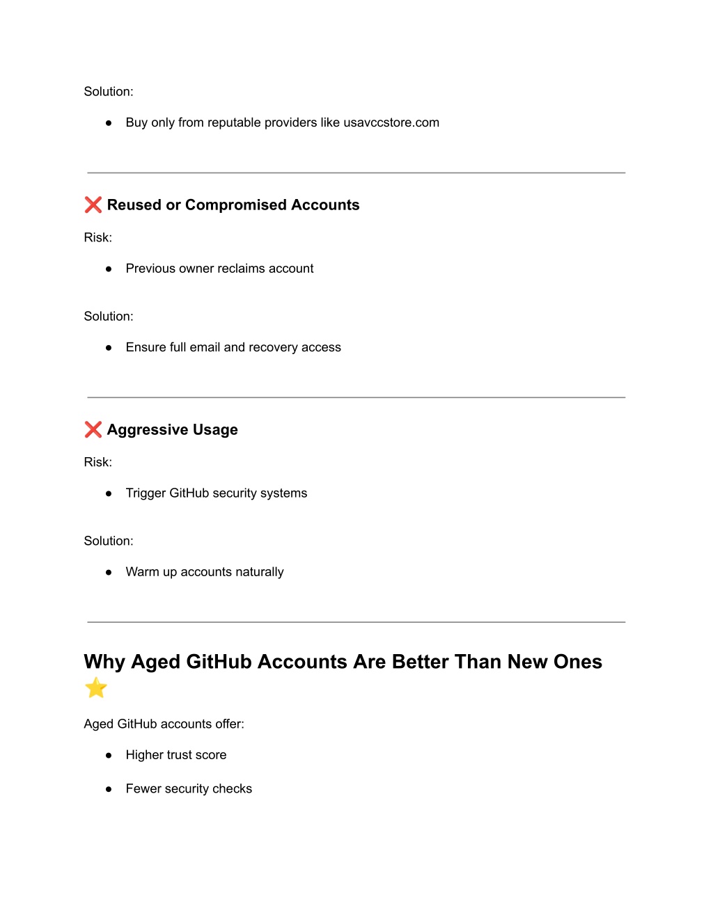 Solution: ● Buy only from reputable providers like usavccstore.com ❌ Reused or Compromised Accounts Risk: ● Previous owner reclaims account Solution: ● Ensure full email and recovery access ❌ Aggressive Usage Risk: ● Trigger GitHub security systems Solution: ● Warm up accounts naturally Why Aged GitHub Accounts Are Better Than New Ones ⭐ Aged GitHub accounts offer: ● Higher trust score ● Fewer security checks