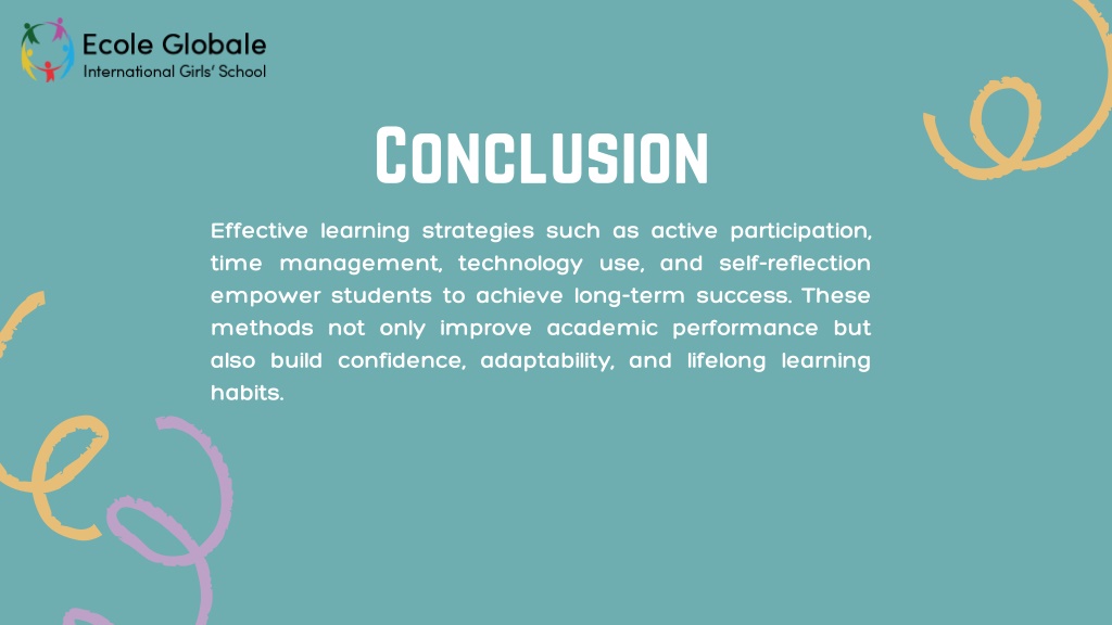 6. Conclusion Effective learning strategies such as active participation, time management, technology use, and self-reflection empower students to achieve long-term success. These methods not only improve academic performance but also build confidence, adaptability, and lifelong learning habits.