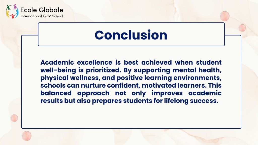 Conclusion Academic excellence is best achieved when student well-being is prioritized. By supporting mental health, physical wellness, and positive learning environments, schools can nurture confident, motivated learners. This balanced approach not only improves academic results but also prepares students for lifelong success.