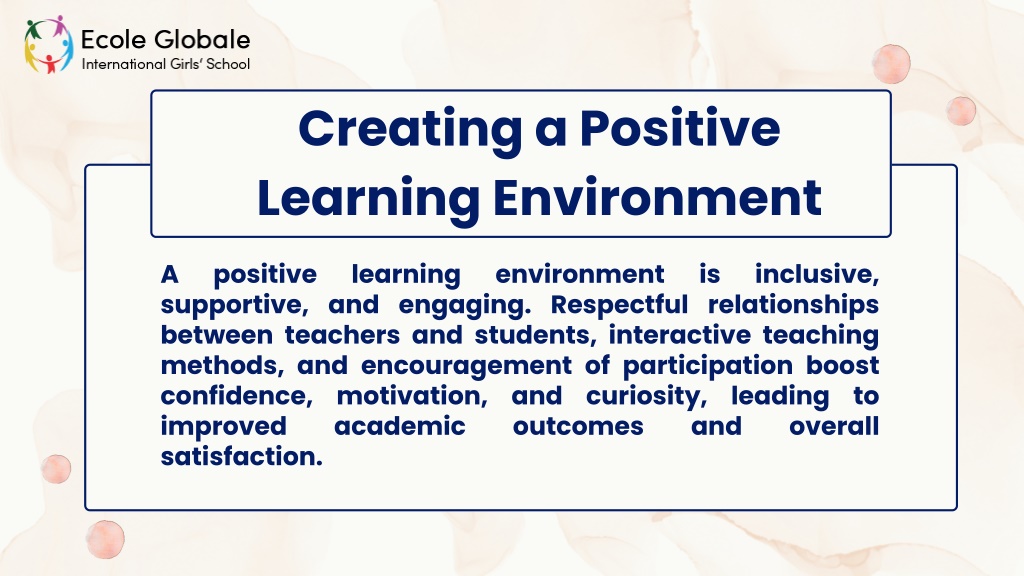 Creating a Positive Learning Environment A supportive, and engaging. Respectful relationships between teachers and students, interactive teaching methods, and encouragement of participation boost confidence, motivation, and curiosity, leading to improved academic outcomes satisfaction. positive learning environment is inclusive, and overall
