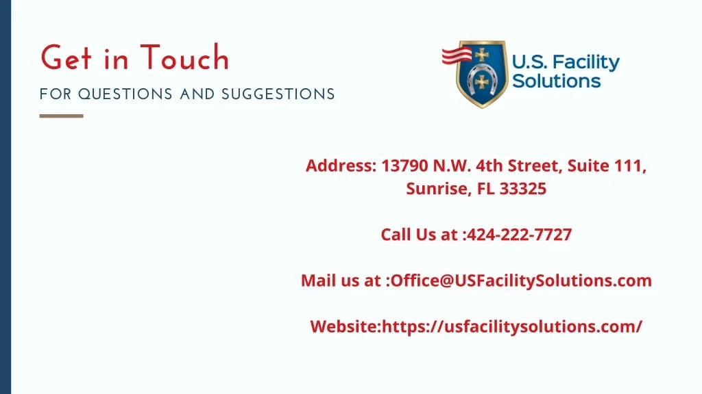 Get in Touch FOR QUESTIONS AND SUGGESTIONS Address: 13790 N.W. 4th Street, Suite 111, Sunrise, FL 33325 Call Us at :424-222-7727 Mail us at :Office@USFacilitySolutions.com Website:https://usfacilitysolutions.com/