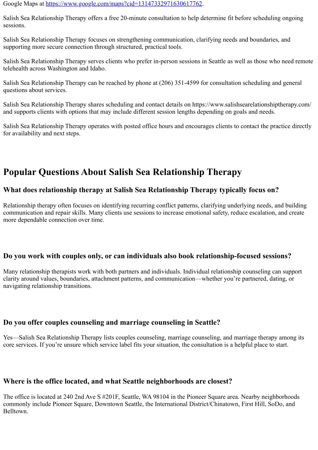 Google Maps at https://www.google.com/maps?cid=13147332971630617762. Salish Sea Relationship Therapy offers a free 20-minute consultation to help determine fit before scheduling ongoing sessions. Salish Sea Relationship Therapy focuses on strengthening communication, clarifying needs and boundaries, and supporting more secure connection through structured, practical tools. Salish Sea Relationship Therapy serves clients who prefer in-person sessions in Seattle as well as those who need remote telehealth across Washington and Idaho. Salish Sea Relationship Therapy can be reached by phone at (206) 351-4599 for consultation scheduling and general questions about services. Salish Sea Relationship Therapy shares scheduling and contact details on https://www.salishsearelationshiptherapy.com/ and supports clients with options that may include different session lengths depending on goals and needs. Salish Sea Relationship Therapy operates with posted office hours and encourages clients to contact the practice directly for availability and next steps. Popular Questions About Salish Sea Relationship Therapy What does relationship therapy at Salish Sea Relationship Therapy typically focus on? Relationship therapy often focuses on identifying recurring conflict patterns, clarifying underlying needs, and building communication and repair skills. Many clients use sessions to increase emotional safety, reduce escalation, and create more dependable connection over time. Do you work with couples only, or can individuals also book relationship-focused sessions? Many relationship therapists work with both partners and individuals. Individual relationship counseling can support clarity around values, boundaries, attachment patterns, and communication—whether you’re partnered, dating, or navigating relationship transitions. Do you offer couples counseling and marriage counseling in Seattle? Yes—Salish Sea Relationship Therapy lists couples counseling, marriage counseling, and marriage therapy among its core services. If you’re unsure which service label fits your situation, the consultation is a helpful place to start. Where is the office located, and what Seattle neighborhoods are closest? The office is located at 240 2nd Ave S #201F, Seattle, WA 98104 in the Pioneer Square area. Nearby neighborhoods commonly include Pioneer Square, Downtown Seattle, the International District/Chinatown, First Hill, SoDo, and Belltown.