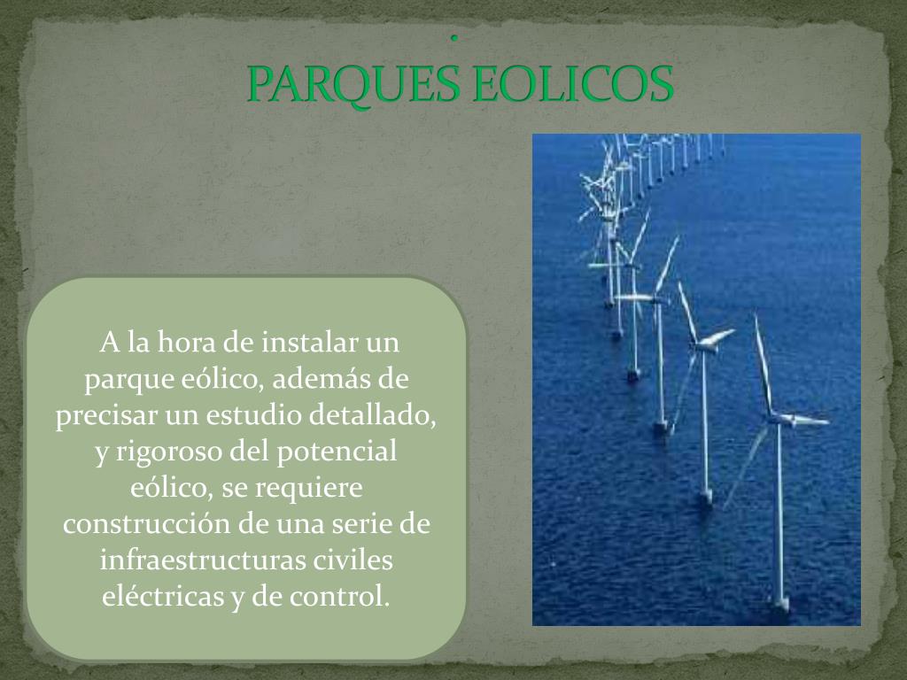 . PARQUES EOLICOS A la hora de instalar un parque eólico, además de precisar un estudio detallado, y rigoroso del potencial eólico, se requiere construcción de una serie de infraestructuras civiles eléctricas y de control.