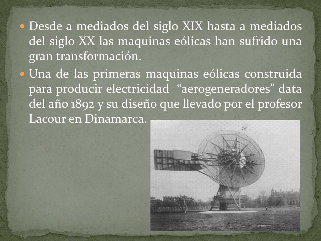 Desde a mediados del siglo XIX hasta a mediados del siglo XX las maquinas eólicas han sufrido una gran transformación. • Una de las primeras maquinas eólicas construida para producir electricidad “aerogeneradores” data del año 1892 y su diseño que llevado por el profesor Lacour en Dinamarca.