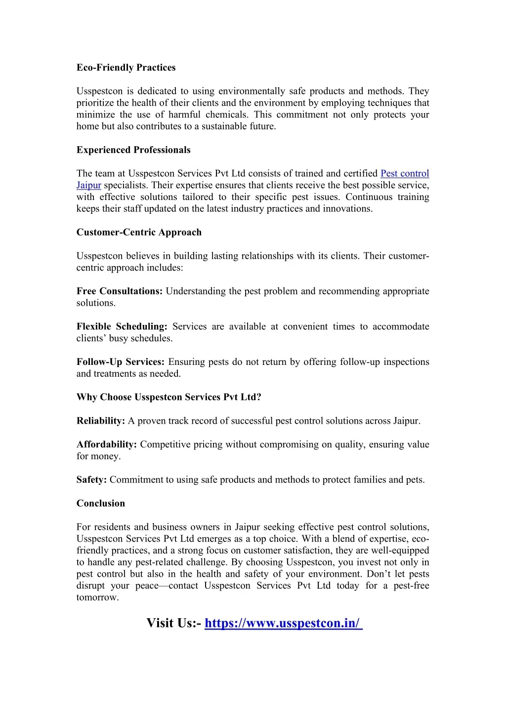 Eco-Friendly Practices Usspestcon is dedicated to using environmentally safe products and methods. They prioritize the health of their clients and the environment by employing techniques that minimize the use of harmful chemicals. This commitment not only protects your home but also contributes to a sustainable future. Experienced Professionals The team at Usspestcon Services Pvt Ltd consists of trained and certified Pest control Jaipur specialists. Their expertise ensures that clients receive the best possible service, with effective solutions tailored to their specific pest issues. Continuous training keeps their staff updated on the latest industry practices and innovations. Customer-Centric Approach Usspestcon believes in building lasting relationships with its clients. Their customer- centric approach includes: Free Consultations: Understanding the pest problem and recommending appropriate solutions. Flexible Scheduling: Services are available at convenient times to accommodate clients’ busy schedules. Follow-Up Services: Ensuring pests do not return by offering follow-up inspections and treatments as needed. Why Choose Usspestcon Services Pvt Ltd? Reliability: A proven track record of successful pest control solutions across Jaipur. Affordability: Competitive pricing without compromising on quality, ensuring value for money. Safety: Commitment to using safe products and methods to protect families and pets. Conclusion For residents and business owners in Jaipur seeking effective pest control solutions, Usspestcon Services Pvt Ltd emerges as a top choice. With a blend of expertise, eco- friendly practices, and a strong focus on customer satisfaction, they are well-equipped to handle any pest-related challenge. By choosing Usspestcon, you invest not only in pest control but also in the health and safety of your environment. Don’t let pests disrupt your peace—contact Usspestcon Services Pvt Ltd today for a pest-free tomorrow. Visit Us:- https://www.usspestcon.in/