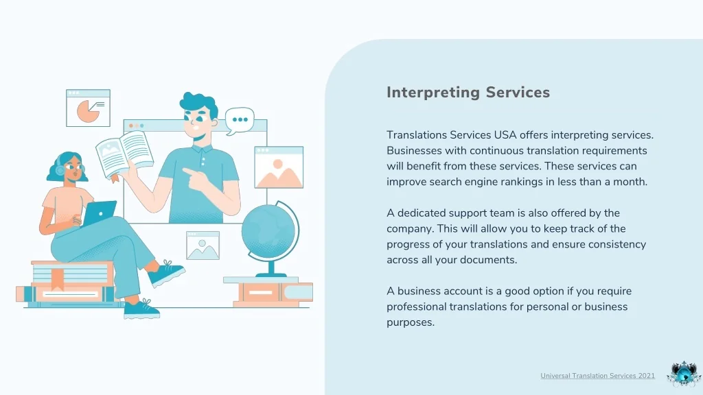 Interpreting Services Translations Services USA offers interpreting services. Businesses with continuous translation requirements will benefit from these services. These services can improve search engine rankings in less than a month. A dedicated support team is also offered by the company. This will allow you to keep track of the progress of your translations and ensure consistency across all your documents. A business account is a good option if you require professional translations for personal or business purposes. Universal Translation Services 2021