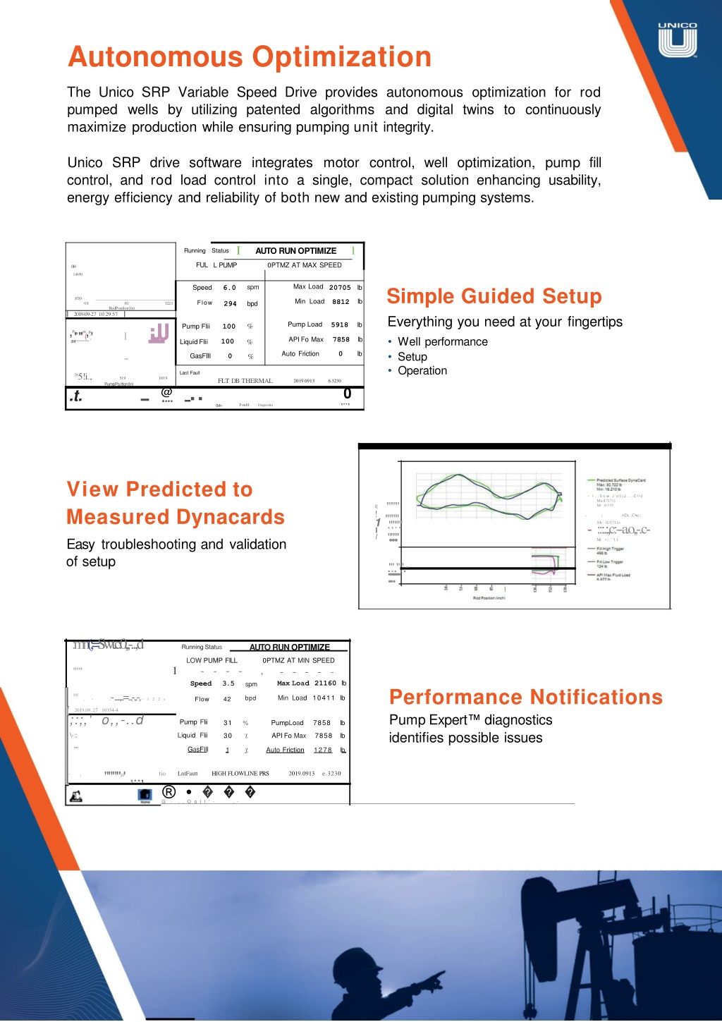 Autonomous Optimization TheUnicoSRPVariableSpeedDriveprovidesautonomousoptimizationforrod pumpedwellsbyutilizingpatentedalgorithmsanddigitaltwinstocontinuously maximizeproductionwhileensuringpumpingunit integrity. UnicoSRPdrivesoftwareintegratesmotorcontrol,welloptimization,pumpfill control,androdloadcontrolintoasingle,compactsolutionenhancingusability, energyefficiencyandreliabilityofboth newandexistingpumpingsystems. • SimpleGuidedSetup • Everythingyouneedatyourfingertips • Wellperformance • Setup • Operation ViewPredictedto MeasuredDynacards Easytroubleshootingandvalidation ofsetup -1.:0owJ'dll)J....Cfld Mu.4.71711 Mr41111 I["""' """' ! -1.•.Dr...C•rc: 1,","."..' ... -:::.:,c:--a.o,,-.c- Mr•1."'11 Mr\$.U711> l """' l ..-'..".-.".'.- :mn(;=Swt.c.0,,,-..,d "'" Running StatusAUTO RUNOPTIMIZE LOWPUMPFILL 0PTMZATMINSPEED 1----, ----- MaxLoad21160lb bpdMinLoad10411lb PerformanceNotifications PumpExpert™diagnostics identifiespossibleissues Speed3.5 Flow42 spm ,-...-....,..=..,-,.-,-122s 101 2019,09..2710354-4 ;:;,'o,,-..dPumpFIii \-::LiquidFIii ""GasFIII 31%PumpLoad7858lb 30'I,APIFoMax7858lb 1'I,AutoFriction1278lb """",u',.., -, tioLntFauttHIGHFLOWLINEPRS2019.0913e.3230 ®•��� G-..Ooll'-,-