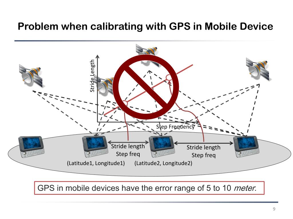 Problem when calibrating with GPS in Mobile Device Stride Length Step Frequency Stride length Step freq Stride length Step freq (Latitude1, Longitude1) (Latitude2, Longitude2) GPS in mobile devices have the error range of 5 to 10 meter.