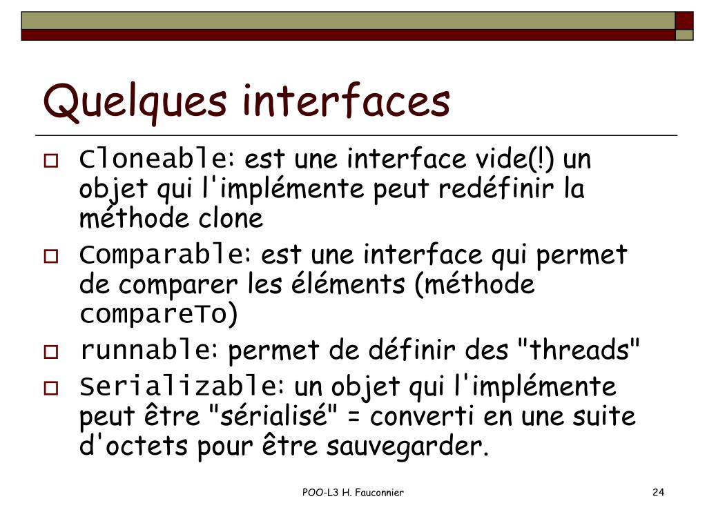 Quelques interfaces • Cloneable: est une interface vide(!) un objet qui l'implémente peut redéfinir la méthode clone • Comparable: est une interface qui permet de comparer les éléments (méthode compareTo) • runnable: permet de définir des "threads" • Serializable: un objet qui l'implémente peut être "sérialisé" = converti en une suite d'octets pour être sauvegarder. POO-L3 H. Fauconnier