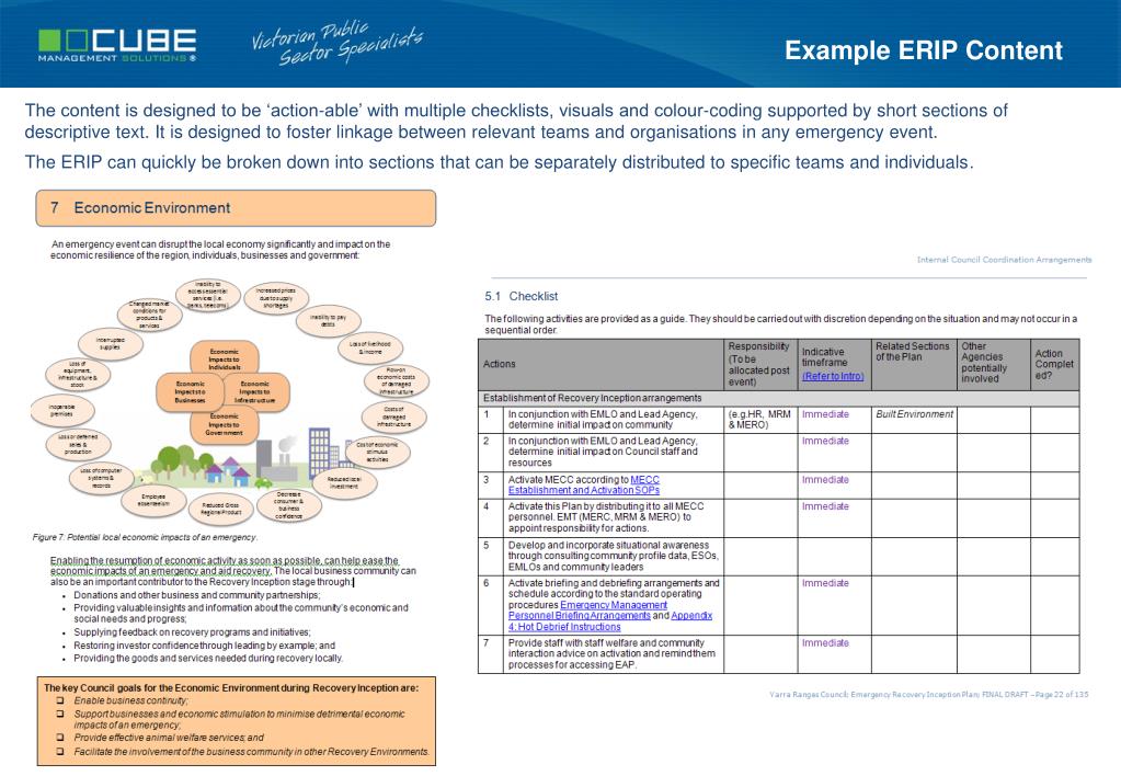 Example ERIP Content The content is designed to be ‘action-able’ with multiple checklists, visuals and colour-coding supported by short sections of descriptive text. It is designed to foster linkage between relevant teams and organisations in any emergency event. The ERIP can quickly be broken down into sections that can be separately distributed to specific teams and individuals.