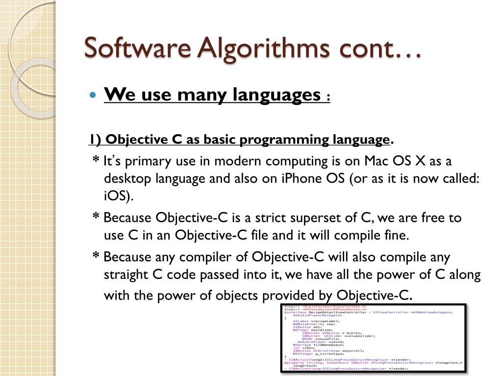 Software Algorithms cont… • We use many languages : 1) Objective C as basic programming language. * Itʼs primary use in modern computing is on Mac OS X as a desktop language and also on iPhone OS (or as it is now called: iOS). * Because Objective-C is a strict superset of C, we are free to use C in an Objective-C file and it will compile fine. * Because any compiler of Objective-C will also compile any straight C code passed into it, we have all the power of C along with the power of objects provided by Objective-C.