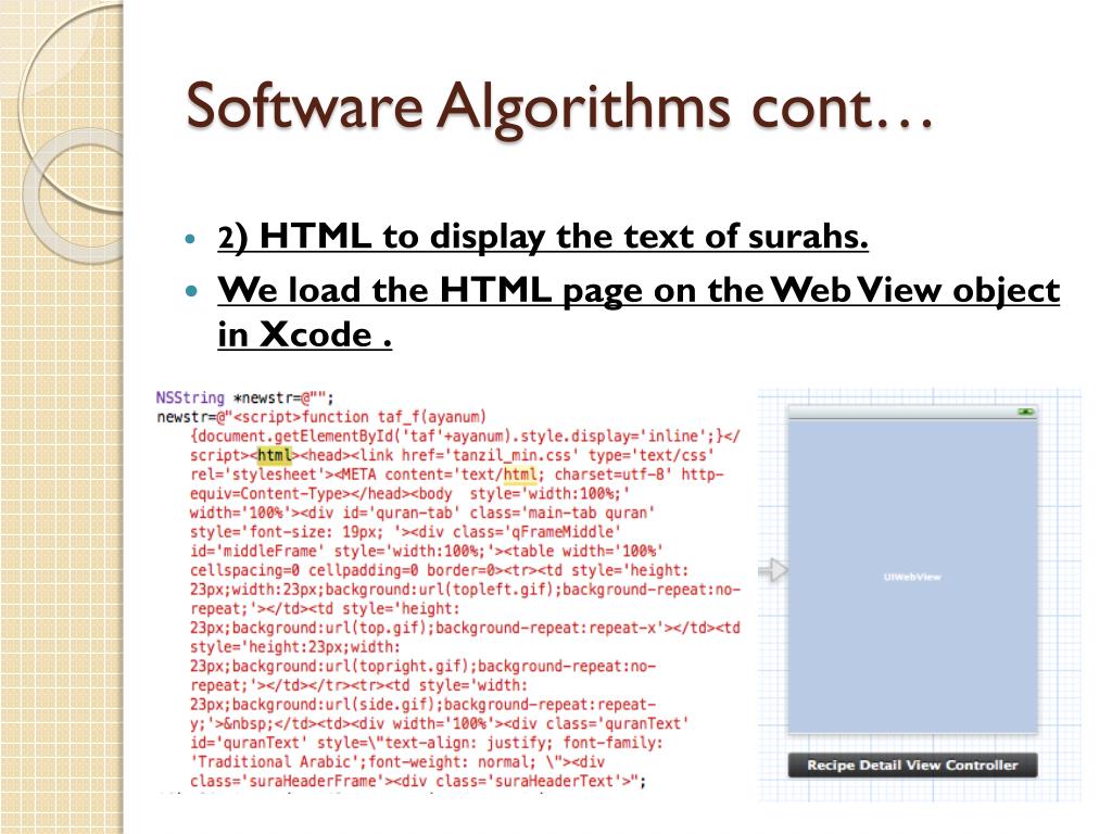 Software Algorithms cont… • 2) HTML to display the text of surahs. • We load the HTML page on the Web View object in Xcode .