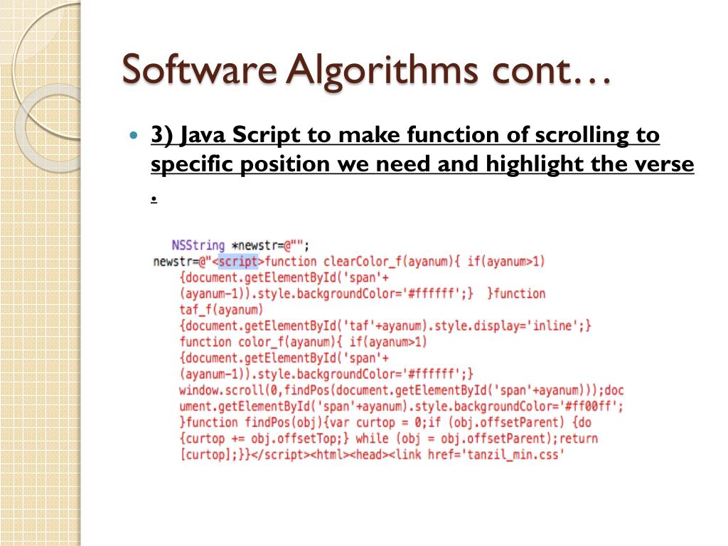 Software Algorithms cont… • 3) Java Script to make function of scrolling to specific position we need and highlight the verse .