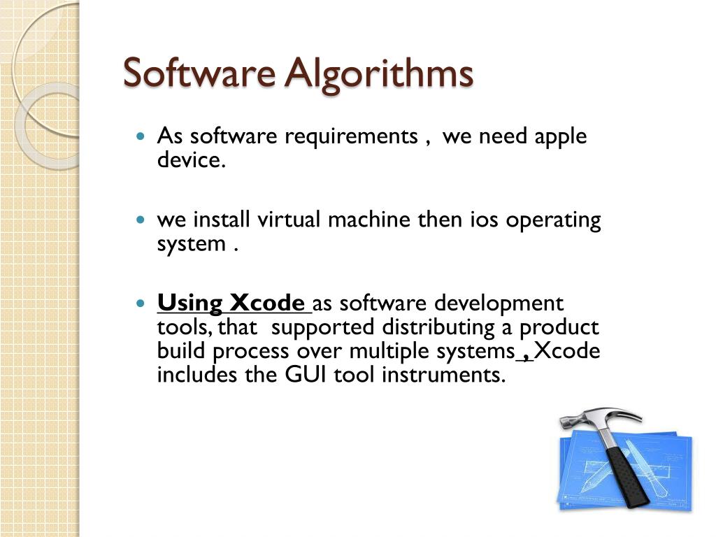 Software Algorithms • As software requirements , we need apple device. • we install virtual machine then ios operating system . • Using Xcodeas software development tools, that supported distributing a product build process over multiple systems , Xcode includes the GUI tool instruments.