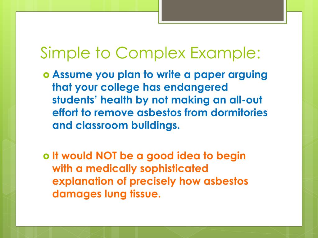Simple to Complex Example: • Assume you plan to write a paper arguing that your college has endangered students’ health by not making an all-out effort to remove asbestos from dormitories and classroom buildings. • It would NOT be a good idea to begin with a medically sophisticated explanation of precisely how asbestos damages lung tissue.