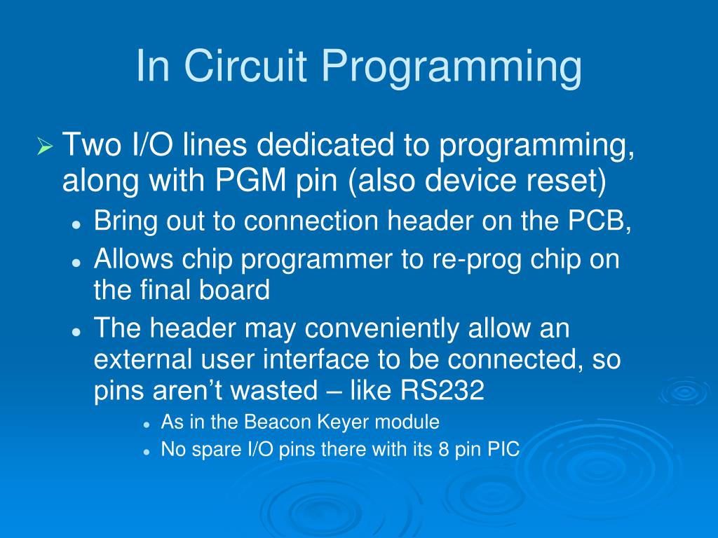In Circuit Programming • Two I/O lines dedicated to programming, along with PGM pin (also device reset) • Bring out to connection header on the PCB, • Allows chip programmer to re-prog chip on the final board • The header may conveniently allow an external user interface to be connected, so pins aren’t wasted – like RS232 • As in the Beacon Keyer module • No spare I/O pins there with its 8 pin PIC