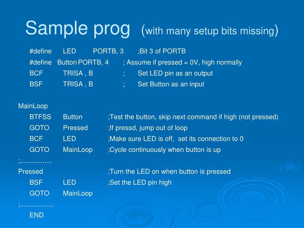 Sample prog (with many setup bits missing) #define LED PORTB, 3 ;Bit 3 of PORTB #define Button PORTB, 4 ; Assume if pressed = 0V, high normally BCF TRISA , B ; Set LED pin as an output BSF TRISA , B ; Set Button as an input MainLoop BTFSS Button ;Test the button, skip next command if high (not pressed) GOTO Pressed ;If pressd, jump out of loop BCF LED ;Make sure LED is off, set its connection to 0 GOTO MainLoop ;Cycle continuously when button is up ;................. Pressed ;Turn the LED on when button is pressed BSF LED ;Set the LED pin high GOTO MainLoop ;.................. END