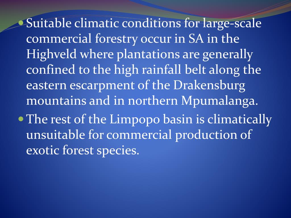 Suitable climatic conditions for large-scale commercial forestry occur in SA in the Highveld where plantations are generally confined to the high rainfall belt along the eastern escarpment of the Drakensburg mountains and in northern Mpumalanga. • The rest of the Limpopo basin is climatically unsuitable for commercial production of exotic forest species.