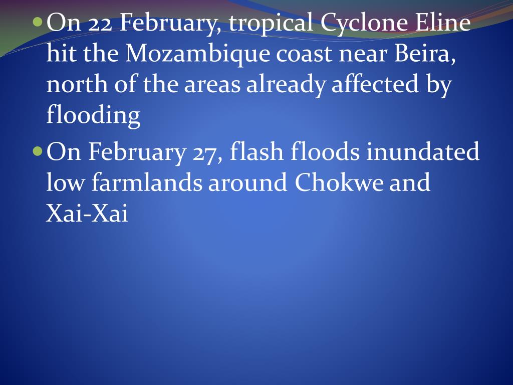 On 22 February, tropical Cyclone Eline hit the Mozambique coast near Beira, north of the areas already affected by flooding • On February 27, flash floods inundated low farmlands around Chokwe and Xai-Xai