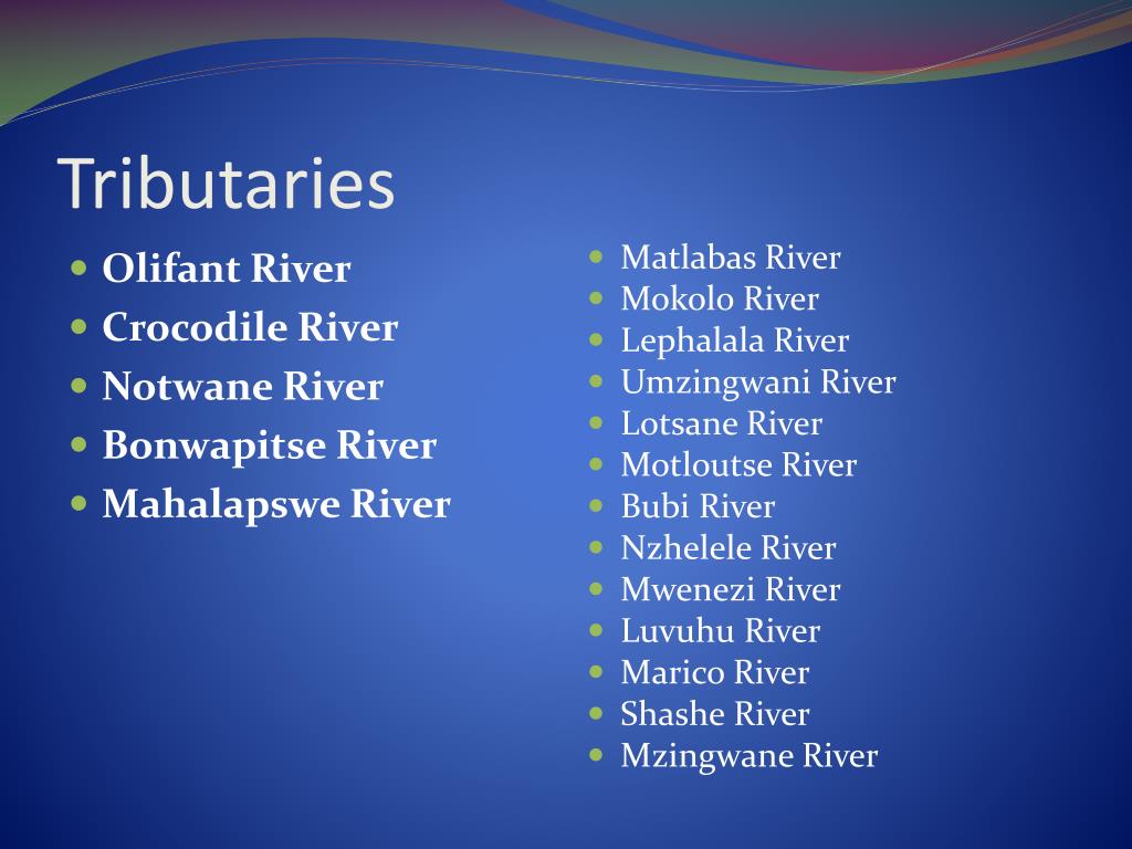 Tributaries • Olifant River • Crocodile River • Notwane River • Bonwapitse River • Mahalapswe River • Matlabas River • Mokolo River • Lephalala River • Umzingwani River • Lotsane River • Motloutse River • Bubi River • Nzhelele River • Mwenezi River • Luvuhu River • Marico River • Shashe River • Mzingwane River