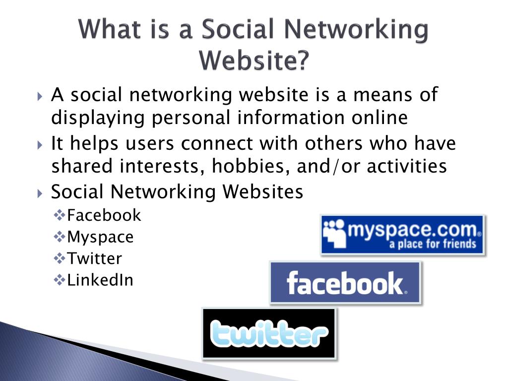 What is a Social Networking Website? • A social networking website is a means of displaying personal information online • It helps users connect with others who have shared interests, hobbies, and/or activities • Social Networking Websites • Facebook • Myspace • Twitter • LinkedIn