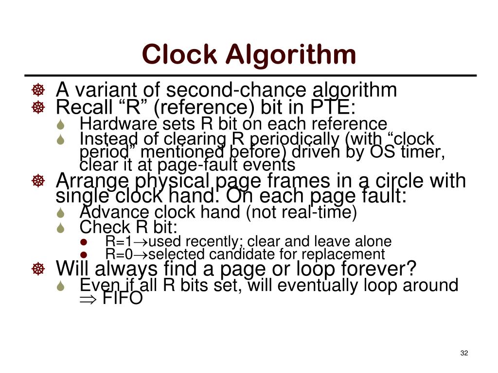Clock Algorithm • A variant of second-chance algorithm • Recall “R” (reference) bit in PTE: • Hardware sets R bit on each reference • Instead of clearing R periodically (with “clock period” mentioned before) driven by OS timer, clear it at page-fault events • Arrange physical page frames in a circle with single clock hand. On each page fault: • Advance clock hand (not real-time) • Check R bit: • R=1used recently; clear and leave alone • R=0selected candidate for replacement • Will always find a page or loop forever? • Even if all R bits set, will eventually loop around FIFO