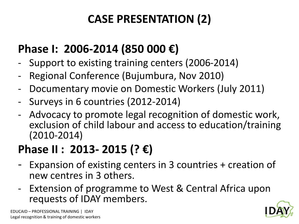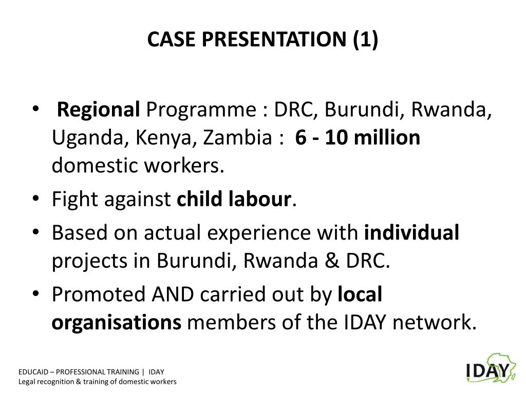 CASE PRESENTATION (1) • Regional Programme : DRC, Burundi, Rwanda, Uganda, Kenya, Zambia : 6 - 10 million domestic workers. • Fight against child labour. • Based on actual experience with individual projects in Burundi, Rwanda & DRC. • Promoted AND carried out by local organisations members of the IDAY network. EDUCAID – PROFESSIONAL TRAINING | IDAY Legal recognition & training of domestic workers