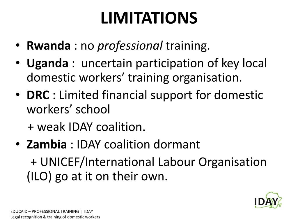 LIMITATIONS • Rwanda : no professional training. • Uganda : uncertain participation of key local domestic workers’ training organisation. • DRC : Limited financial support for domestic workers’ school + weak IDAY coalition. • Zambia : IDAY coalition dormant + UNICEF/International Labour Organisation (ILO) go at it on their own. EDUCAID – PROFESSIONAL TRAINING | IDAY Legal recognition & training of domestic workers