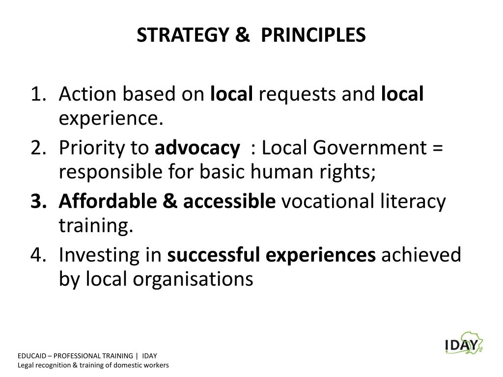 STRATEGY & PRINCIPLES • Action based on local requests and local experience. • Priority to advocacy : Local Government = responsible for basic human rights; • Affordable & accessible vocational literacy training. • Investing in successful experiences achieved by local organisations EDUCAID – PROFESSIONAL TRAINING | IDAY Legal recognition & training of domestic workers