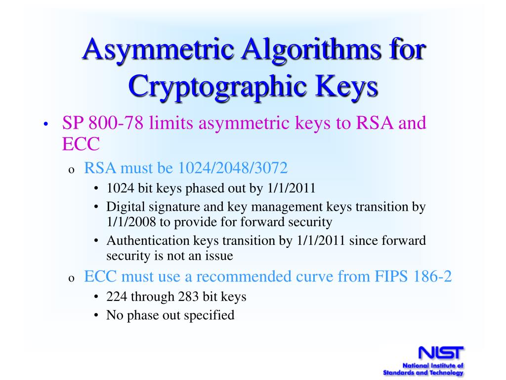 Asymmetric Algorithms for Cryptographic Keys • SP 800-78 limits asymmetric keys to RSA and ECC • RSA must be 1024/2048/3072 • 1024 bit keys phased out by 1/1/2011 • Digital signature and key management keys transition by 1/1/2008 to provide for forward security • Authentication keys transition by 1/1/2011 since forward security is not an issue • ECC must use a recommended curve from FIPS 186-2 • 224 through 283 bit keys • No phase out specified