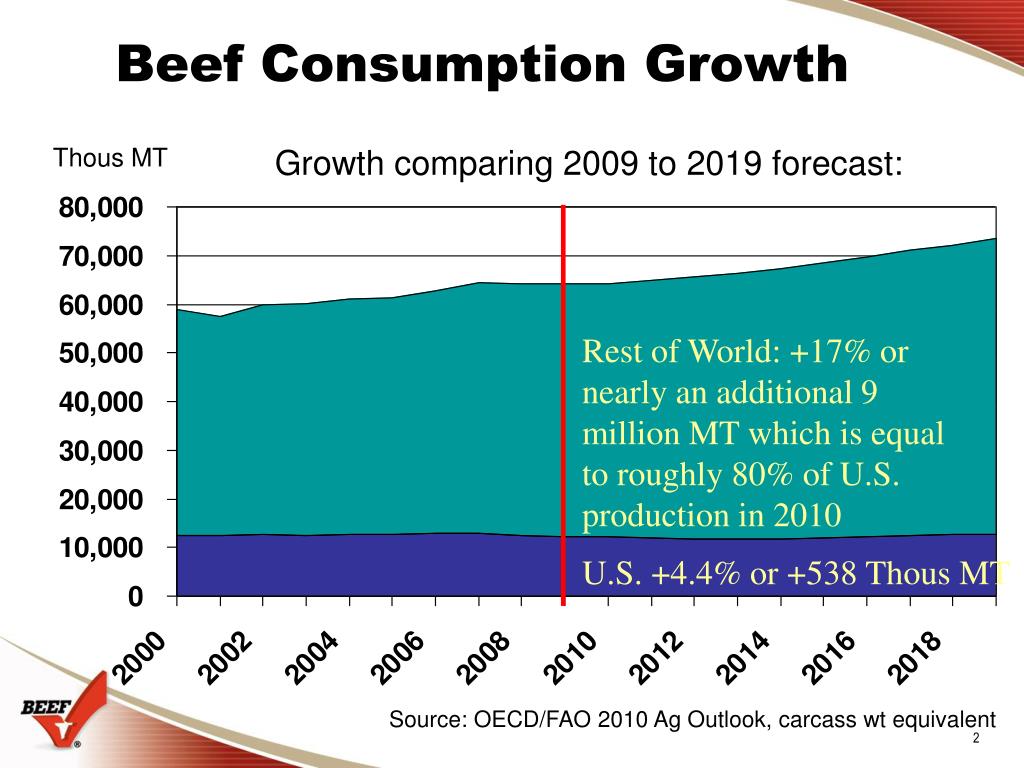Beef Consumption Growth Thous MT Growth comparing 2009 to 2019 forecast: Rest of World: +17% or nearly an additional 9 million MT which is equal to roughly 80% of U.S. production in 2010 U.S. +4.4% or +538 Thous MT Source: OECD/FAO 2010 Ag Outlook, carcass wt equivalent