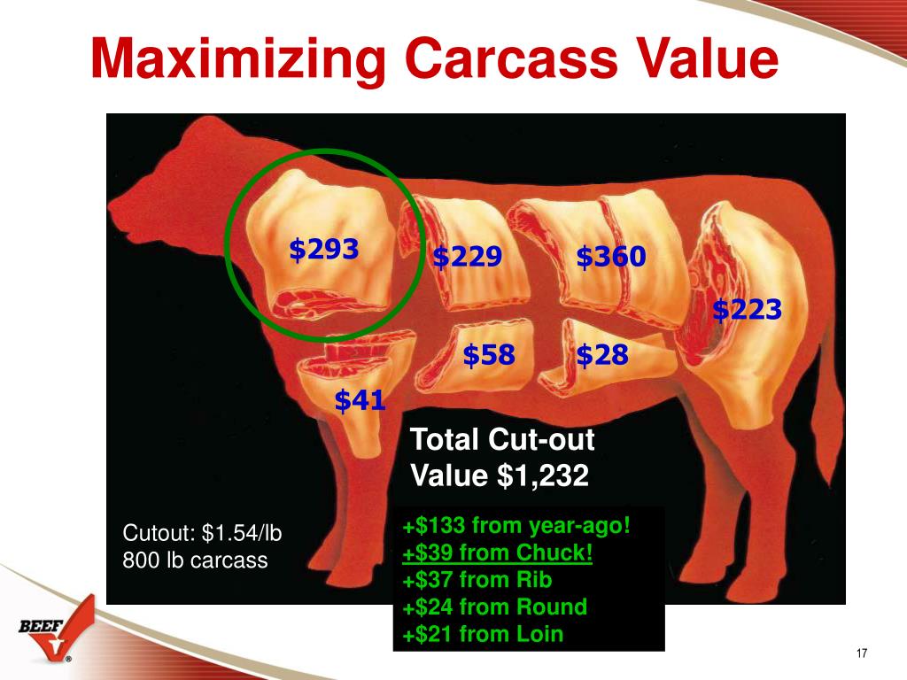 Maximizing Carcass Value $293 $229 $360 $223 $58 $28 $41 Total Cut-out Value $1,232 +$133 from year-ago! +$39 from Chuck! +$37 from Rib +$24 from Round +$21 from Loin Cutout: $1.54/lb 800 lb carcass
