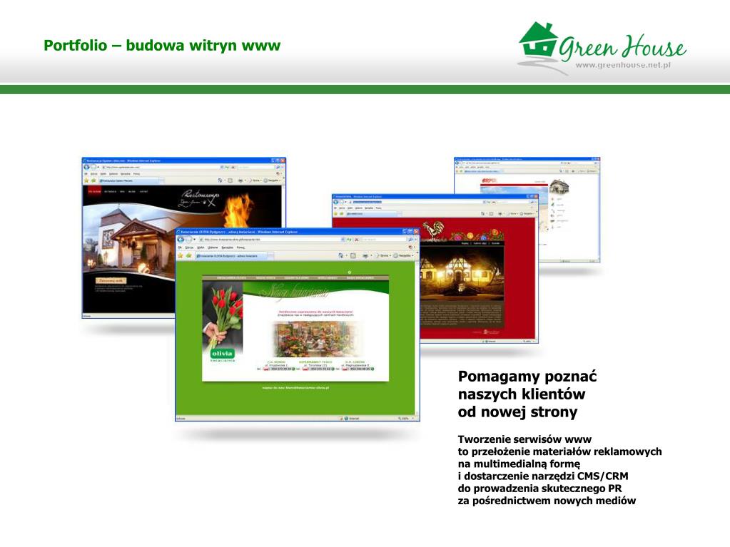 Portfolio – budowa witryn www Pomagamy poznać naszych klientów od nowej strony Tworzenie serwisów www to przełożenie materiałów reklamowych na multimedialną formę i dostarczenie narzędzi CMS/CRM do prowadzenia skutecznego PR za pośrednictwem nowych mediów