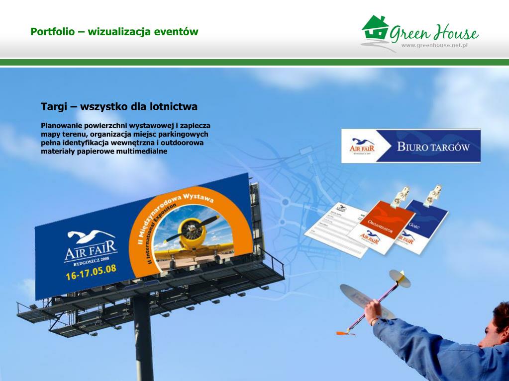 Portfolio – wizualizacja eventów Targi – wszystko dla lotnictwa Planowanie powierzchni wystawowej i zaplecza mapy terenu, organizacja miejsc parkingowych pełna identyfikacja wewnętrzna i outdoorowa materiały papierowe multimedialne