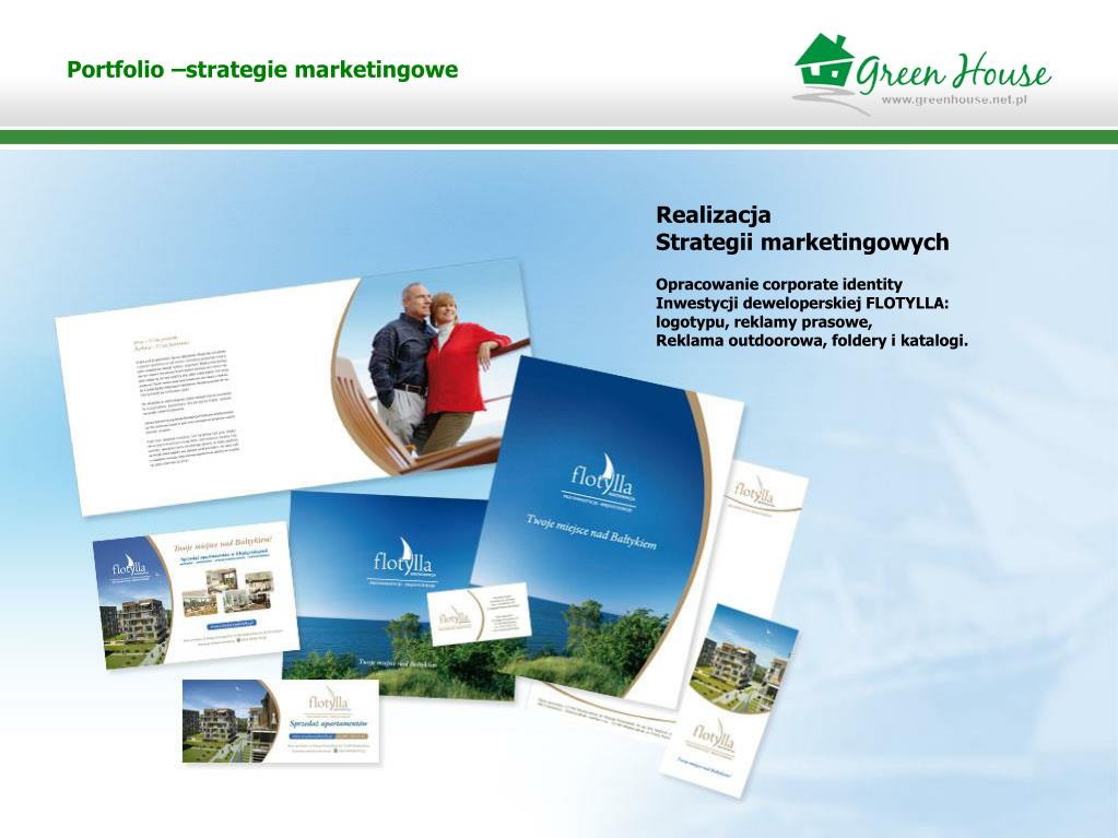 Portfolio –strategie marketingowe Realizacja Strategii marketingowych Opracowanie corporate identity Inwestycji deweloperskiej FLOTYLLA: logotypu, reklamy prasowe, Reklama outdoorowa, foldery i katalogi.